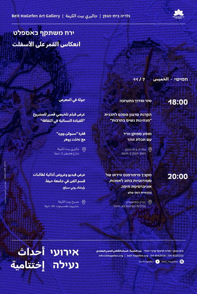 On Thursday, July 11, 2019, a tour of the group exhibition “The Moon’s Reflection on the Asphalt” will take place with curators and participating artists, followed by a film documenting the year-long series of encounters between Jewish and Arab Israeli women artists which led up to the exhibition. The evening will conclude with spoken word artist Tchelet Zohar, followed by Haifa University student video art and perfomances.