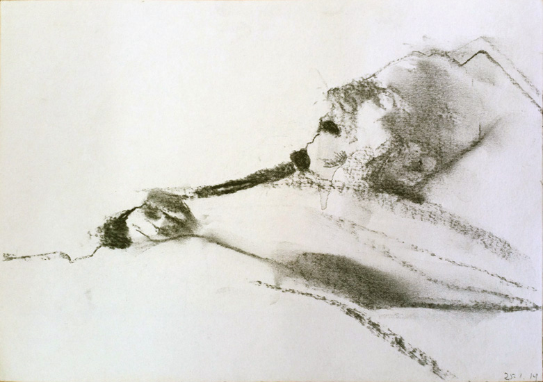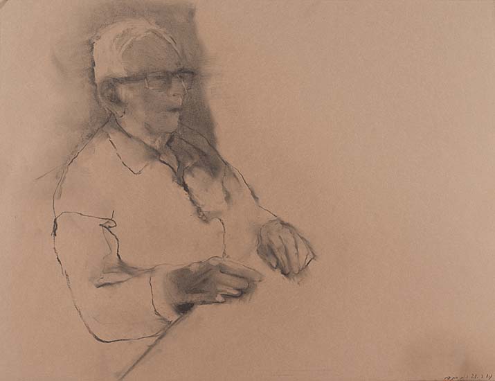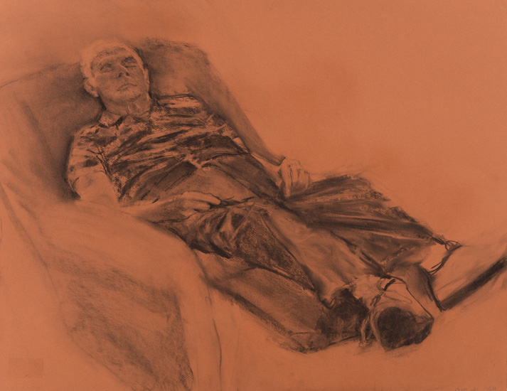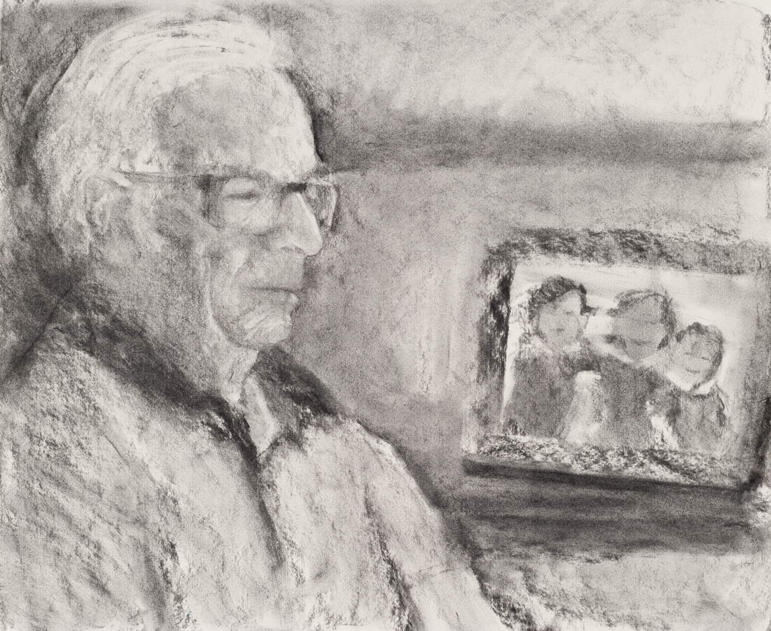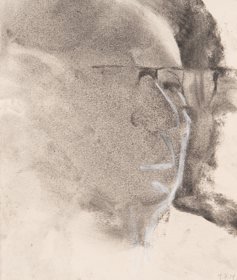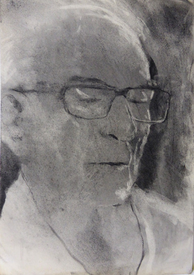 All of the works are charcoal on paper of varying sizes (mostly 50 X 65 cm, 19.5″ X 25.5″, and from the years 2011-2014), except the following one, which combines charcoal and paint on canvas, and includes an image of my father and me, based on an old photograph.