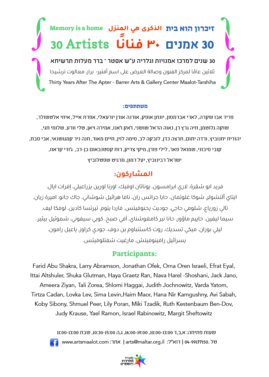 תערוכה קבוצתית במרכז אמנויות מעלות החוגגת שלושים שנות פעילות עם עבודותיהם של שלושים אמנים.