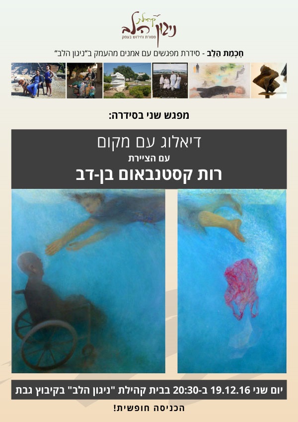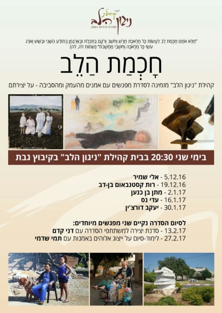 שיחה על עבודותיי בסדרת "חכמת הלב" ביום ב' 19.12 בשעה 20.30 תתקיים הרצאה שלי כחלק מסדרת שיחות עם אמנים, בקהילת ניגון הלב בקיבוץ גבת.