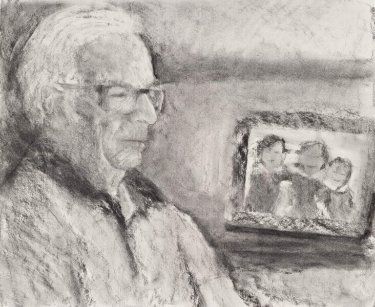 ציור רישומי של האב המבוגר בגווני אפור, ובפינה דימוי צבעוני של האב והבת לקוח מצילום ישן