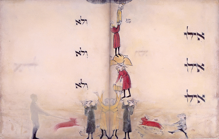 If/ Not, 1999, oil on canvas (based on the Birds’ Head Haggada, 13th century), 50 X 79 cm, private collection, Jerusalem