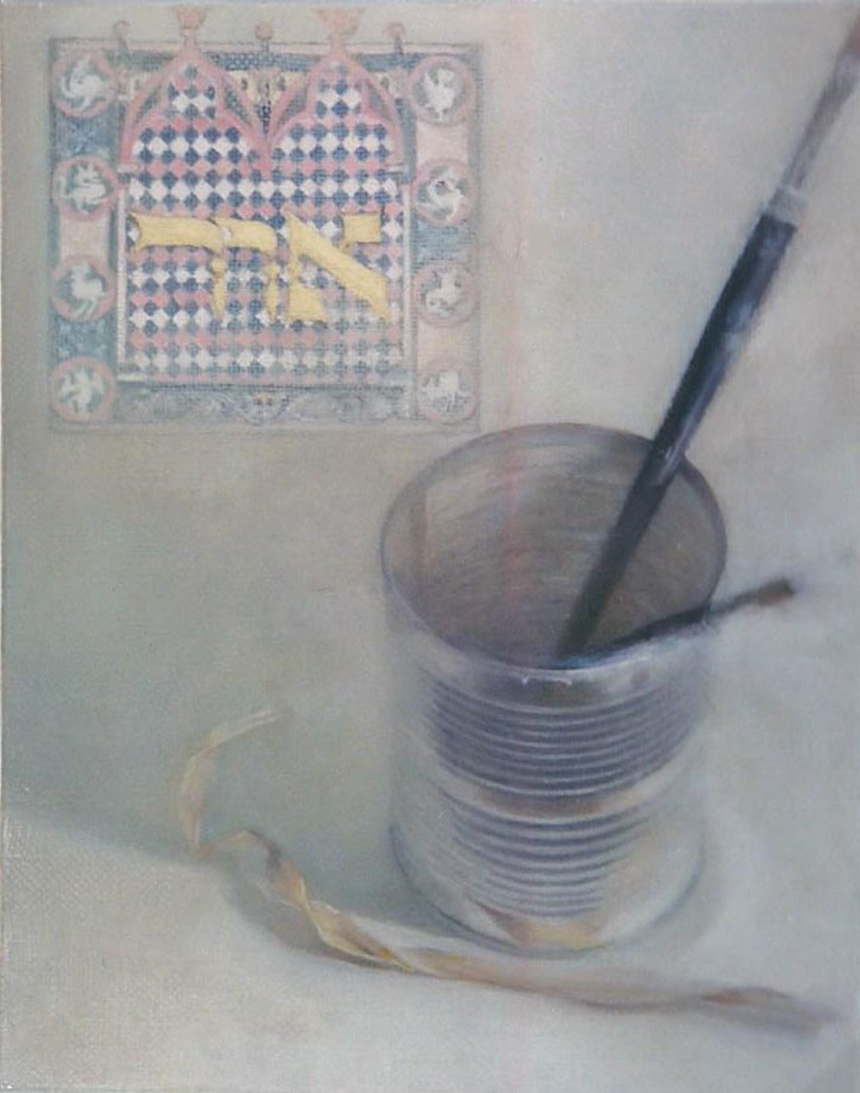 Light 1, 1999, oil on canvas, 24 X 31 cm; still life and painted reference to illuminated Haggada, private collection, Jerusalem