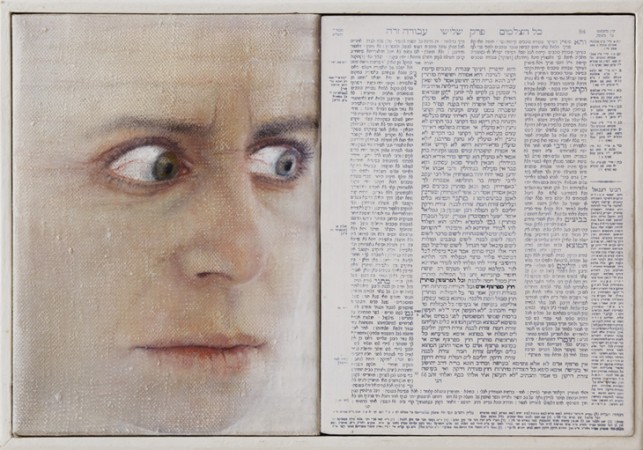 In Reading Faces, a painting of my face is juxtaposed with a page of Talmud including an emphasized passage forbidding portraiture: “All faces are permitted except for the human face.” The eyes are looking at the text. A strong visual dialogue and connection are created between them and the text, as between the structure and texture of the text and that of the painted canvas. This dialogue denies the relationship of absolute negation that the words of the text imply.