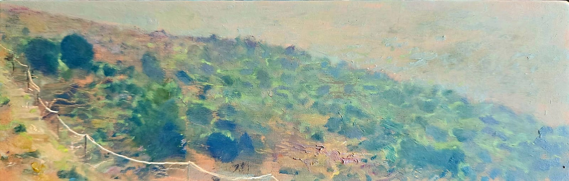 Drawing and painting the landscape in small formats has accompanied my creative work for years – for example, here and here (see the 20/24 landscapes appearing towards the end of the latter post). I work on my studio balcony, standing by a window, and sometimes outside, on the ground.